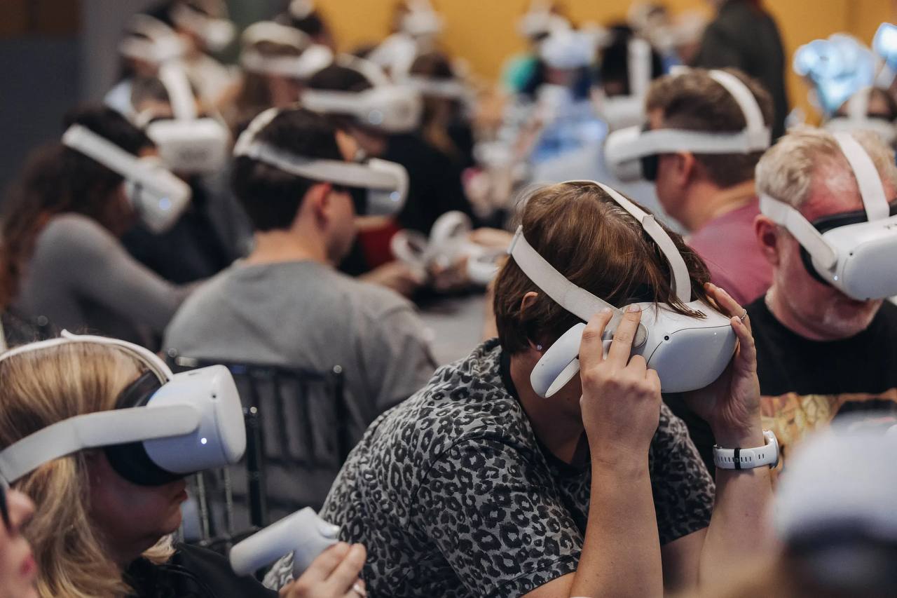 80 гостей синхронно погрузились в альтернативную реальность и под грамотным руководством VR художницы Надежды Бей рисовали свои миры в виртуальном пространстве цифровыми кистями.